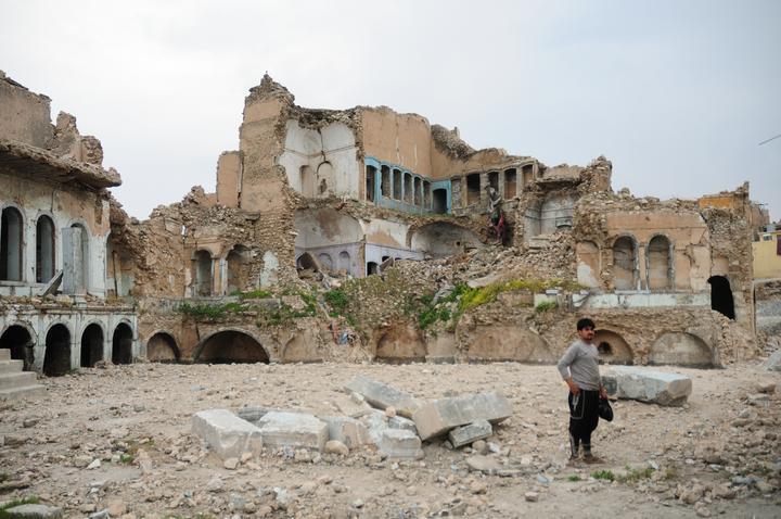 一名男子站在位于伊拉克尼尼微省的摩苏尔老城废墟前。