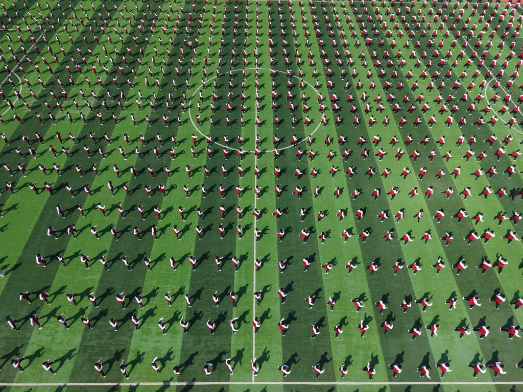 3月20日,河南省焦作市温县一中学生在课间操时间集体习练太极拳(无人机照片)。新华社发 徐宏星 摄