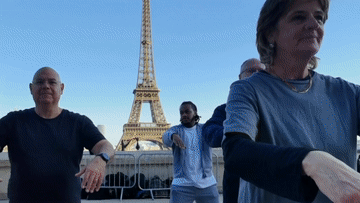 国际太极拳日前夕,太极爱好者在法国巴黎埃菲尔铁塔下习练太极拳。
