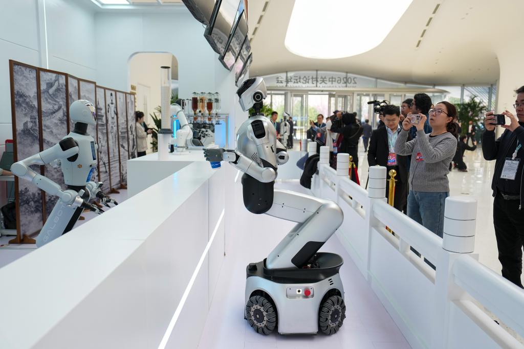 3月25日,在中关村国际创新中心,嘉宾在参观机器人餐吧。 新华社记者 鞠焕宗 摄