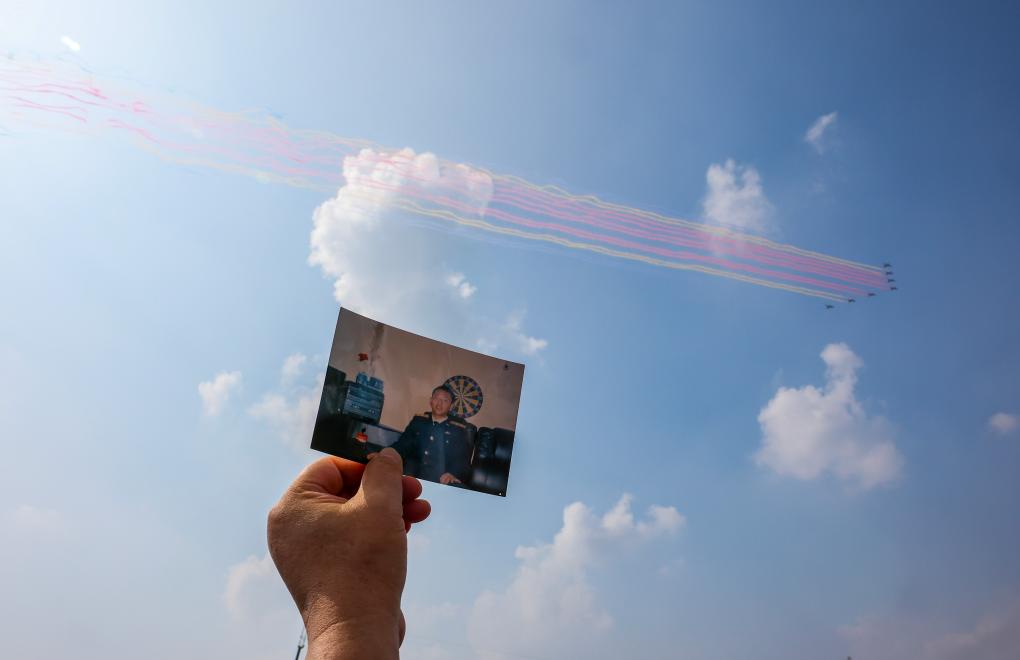 2025年9月3日,纪念中国人民抗日战争暨世界反法西斯战争胜利80周年大会在北京天安门广场隆重举行。当空中梯队飞过天安门广场时,王伟的妻子阮国琴在观礼台上把王伟的照片举向蓝天,她大声说:“王伟,你和战友们又见面了!”