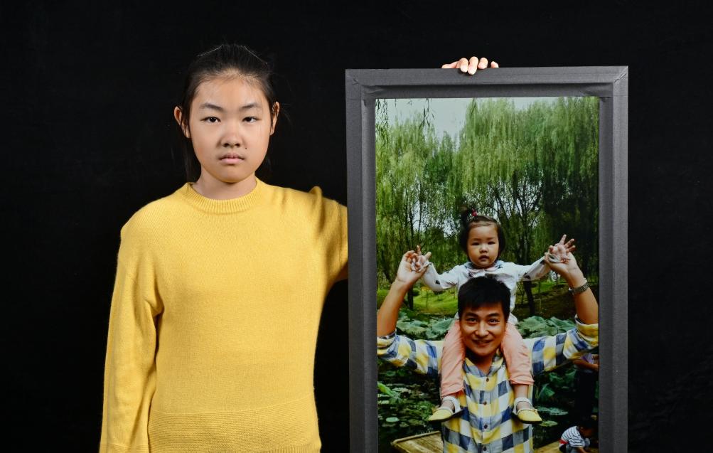 张超的女儿张上明珠手扶与父亲的合影。父亲牺牲时,她只有两岁。