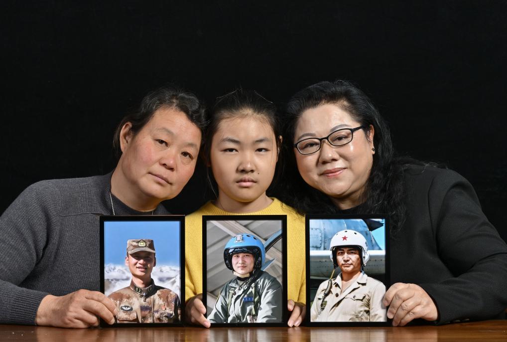 王伟的妻子阮国琴(右)、张超的女儿张上明珠(中)、肖思远的母亲刘利霞手捧烈士照片合影。
