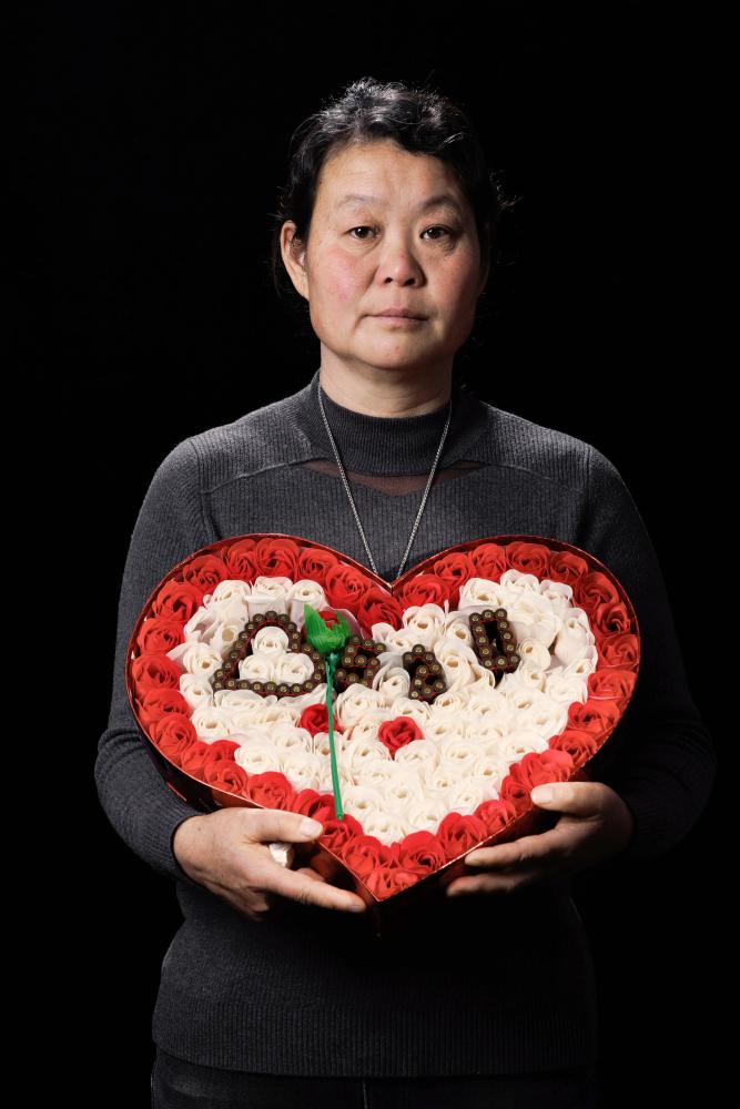 肖思远的母亲刘利霞怀抱儿子制作的母亲节礼物,子弹壳在玫瑰花组成的心形中拼出“520”(我爱您)字样。