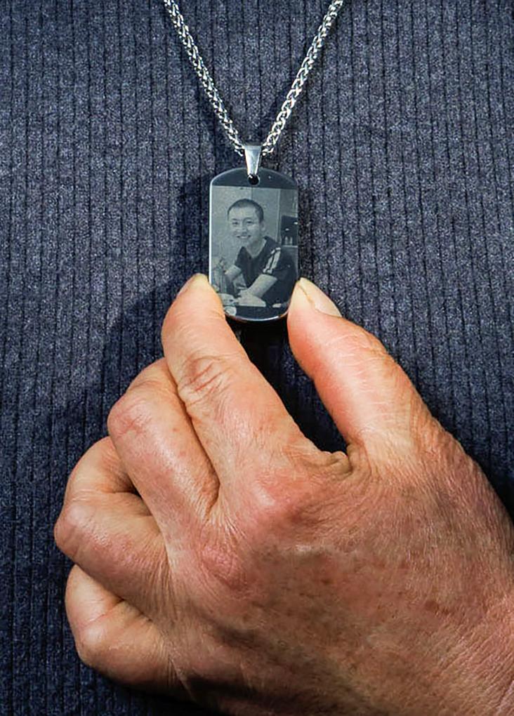 肖思远的母亲刘利霞佩戴着用儿子照片制作的纪念项链。