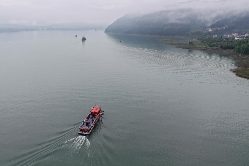 3月31日,“新渝忠客2180”客轮前往忠县县城西山码头(无人机照片)。