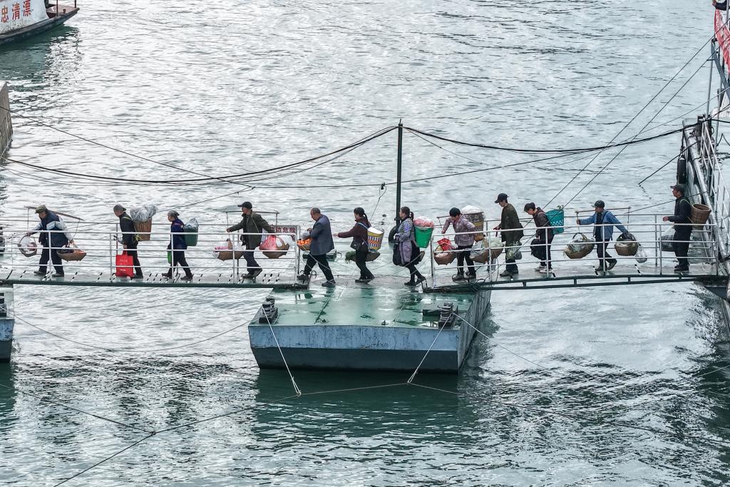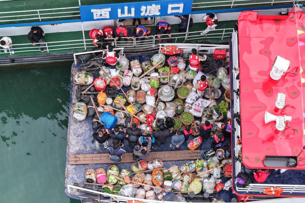 3月31日,“新渝忠客2180”客轮抵达忠县县城后,菜农下船前往集市售卖农特产品(无人机照片)。