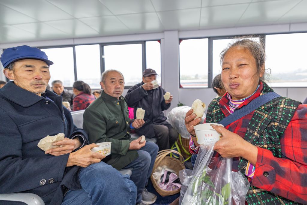 3月31日,菜农在“新渝忠客2180”客轮开行过程中品尝免费爱心早餐。