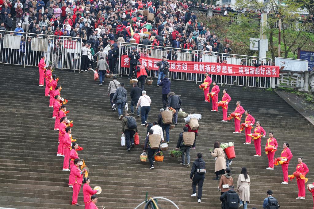 3月31日,在重庆忠县西山码头,群众热情欢迎搭乘首趟“新渝忠客2180”客轮的乘客。