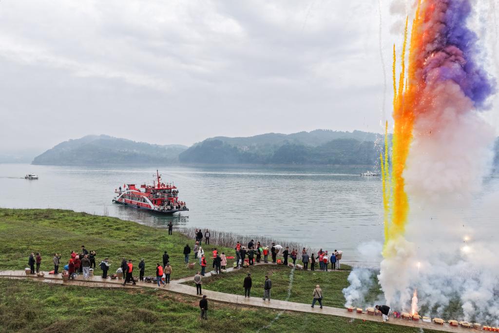 3月31日,人们自发点燃烟花庆祝“新渝忠客2180”客轮的首航(无人机照片)。