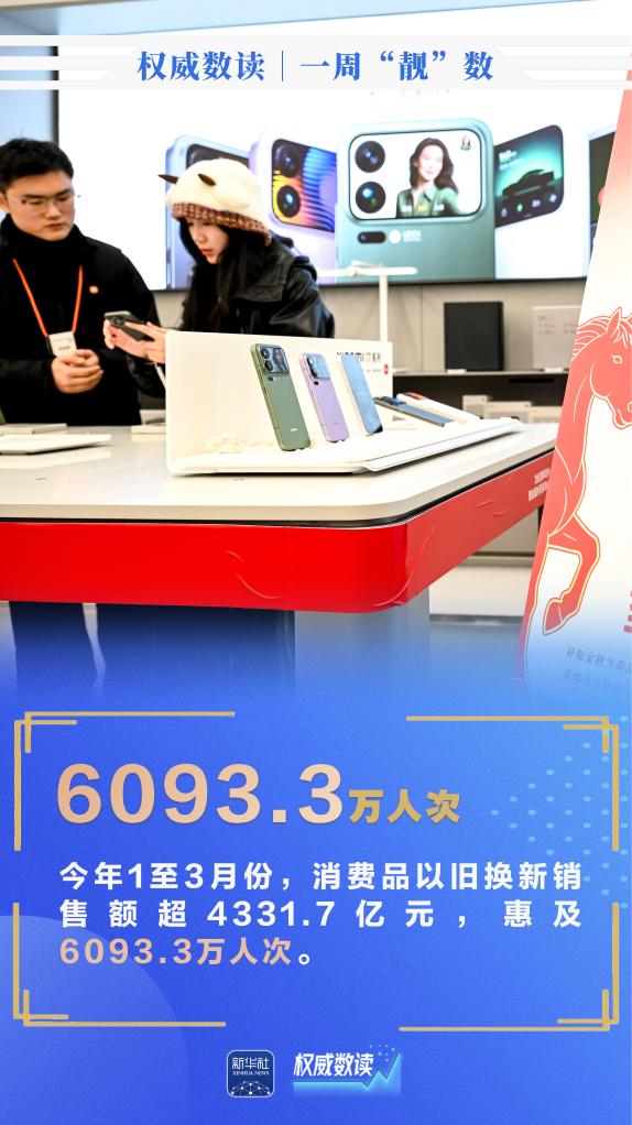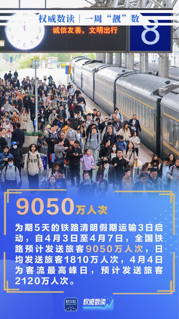 自4月3日至7日,全国铁路预计发送旅客9050万人次;1至3月份,消费品以旧换新销售额超4331.7亿元,惠及人次超6000万;2020年至2025年,我国人均年快递使用量从59件增长到141件……本周,这些数据最值得关注!