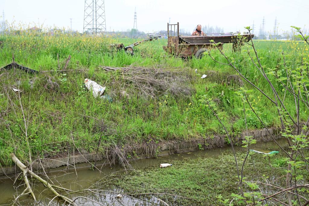 在华东某省,多个农药瓶和农药包装袋被丢弃在一处农田和水渠中(4月2日摄)。