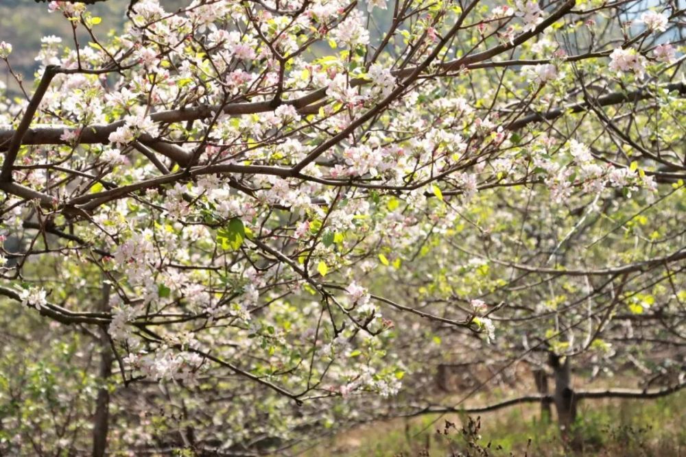 沿山间公路蜿蜒而上,车窗外灰褐的石山夹杂着灌木与湿地松,视野渐渐被一团团、一片片粉白的轻纱覆盖——那是正值盛花期的山地苹果园。路边还不时出现几株桃花、梨花。