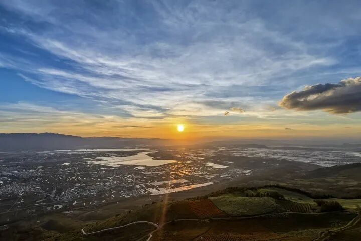傍晚时分,走出苹果园,登上西北勒大风垭口的观景台俯瞰,苹果花海在脚下铺展,晚霞在云层中变幻,公路熠熠生辉,长桥海与大屯海像两面镜子散布在蒙自坝子上。夕阳把水面染成粼粼的金箔,与远处山峦形成一种特有的辽阔与宁静。