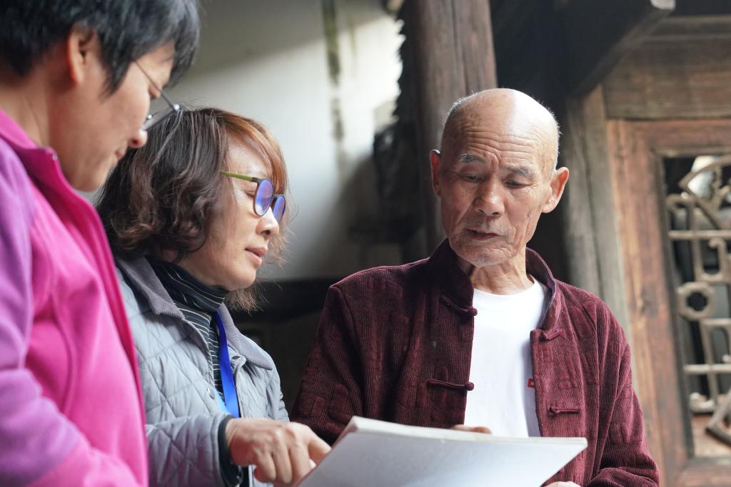 唐以金(右一)在进行古建修复方案讨论。新华社记者 赵欢 摄