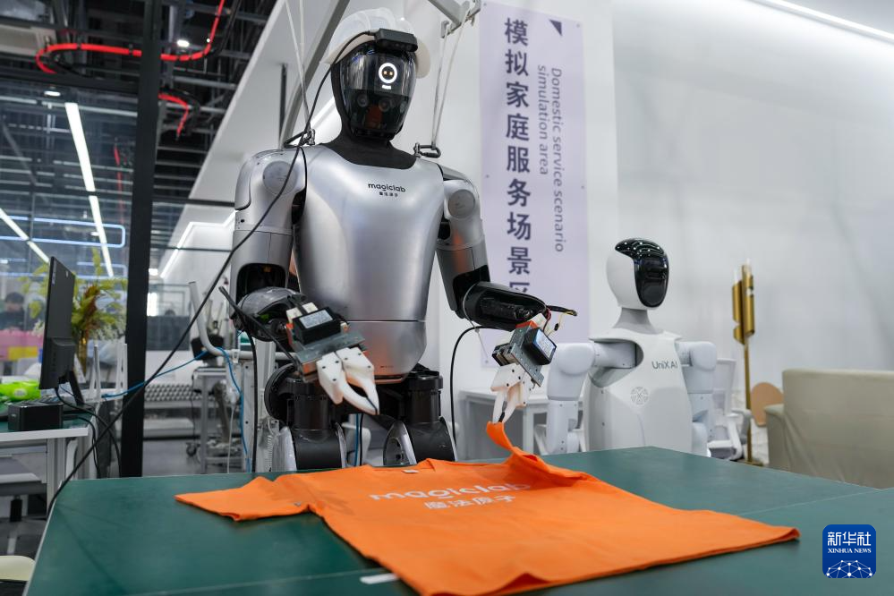 在苏州市具身智能机器人综合创新中心,机器人在模拟家庭服务场景内叠衣服(2026年3月10日摄)。新华社记者 李博 摄