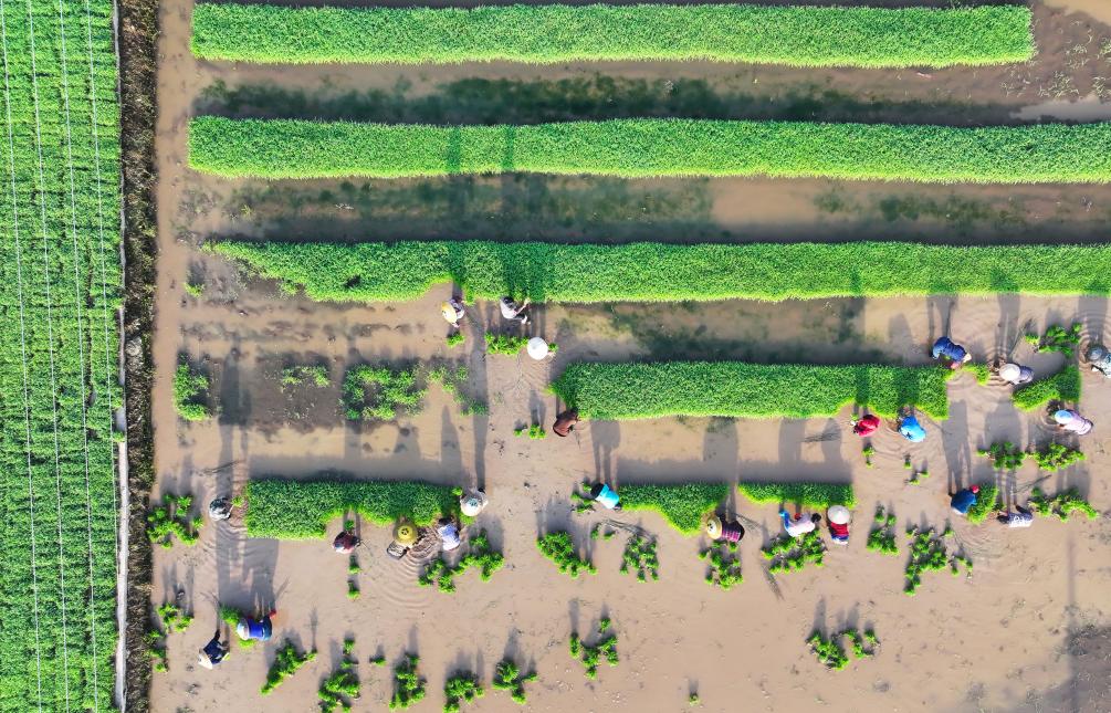 4月19日,湖南省衡阳市祁东县金桥镇农民在起秧苗(无人机照片)。新华社发(曹正平摄)