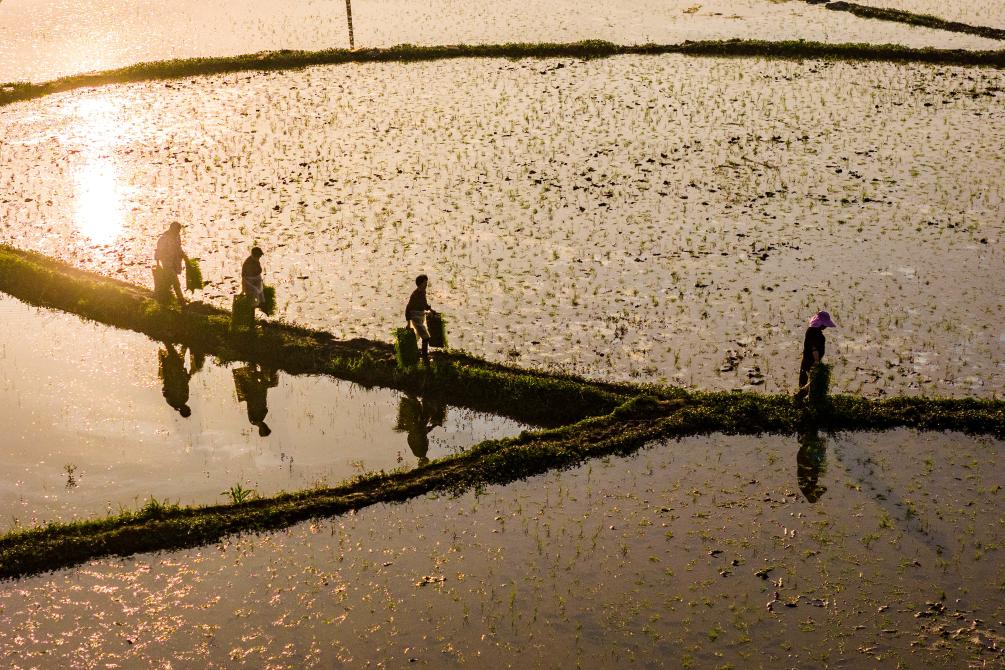 4月19日,在湖南省娄底市双峰县井字镇蒋市村,农民拎着秧苗前往大田准备抛秧(无人机照片)。 新华社发(李建新摄)
