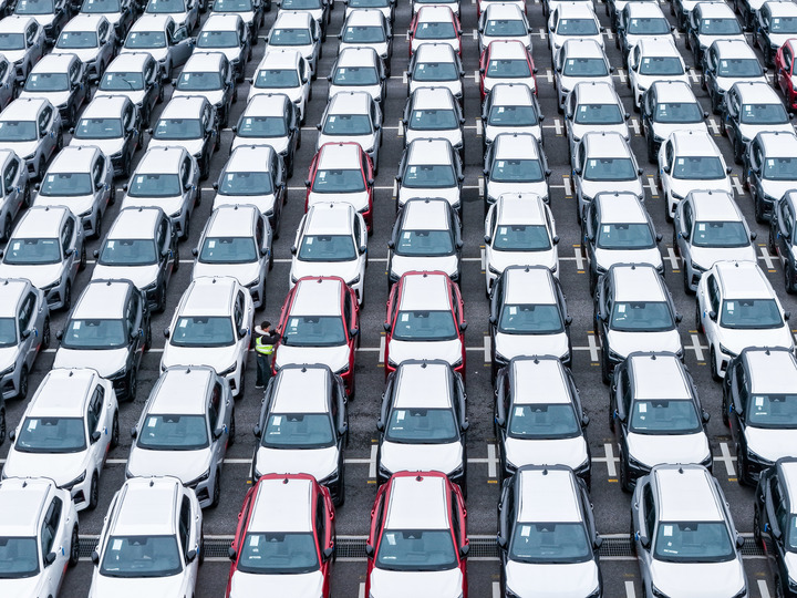 在江苏太仓港汽车码头堆场里拍摄的准备运输出海的商品车(无人机照片)。新华社记者 李博 摄