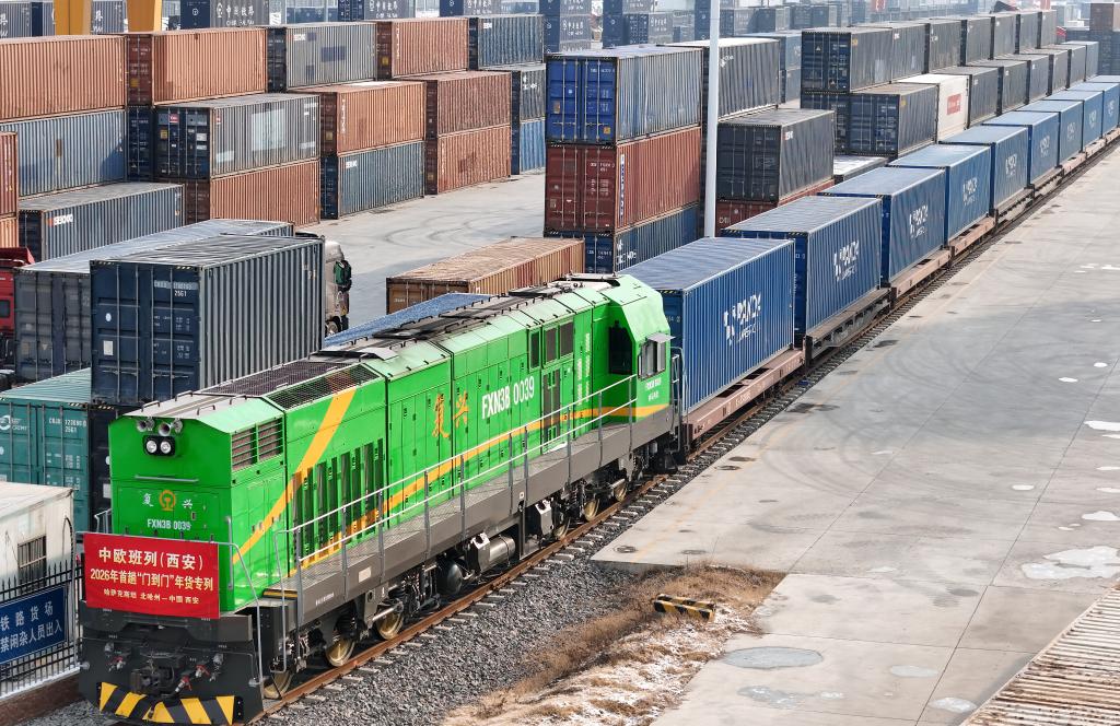 1月21日,2026年首趟中欧班列(西安)“门到门”年货专列满载着哈萨克斯坦成品粮油、蜂蜜等农产品驶抵西安。新华社记者李一博 摄
