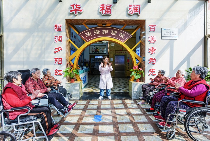 2026年3月25日,在山东省胶州市华福润养护院,护理人员和老人一起做手指操。 新华社发(王昭脉 摄)