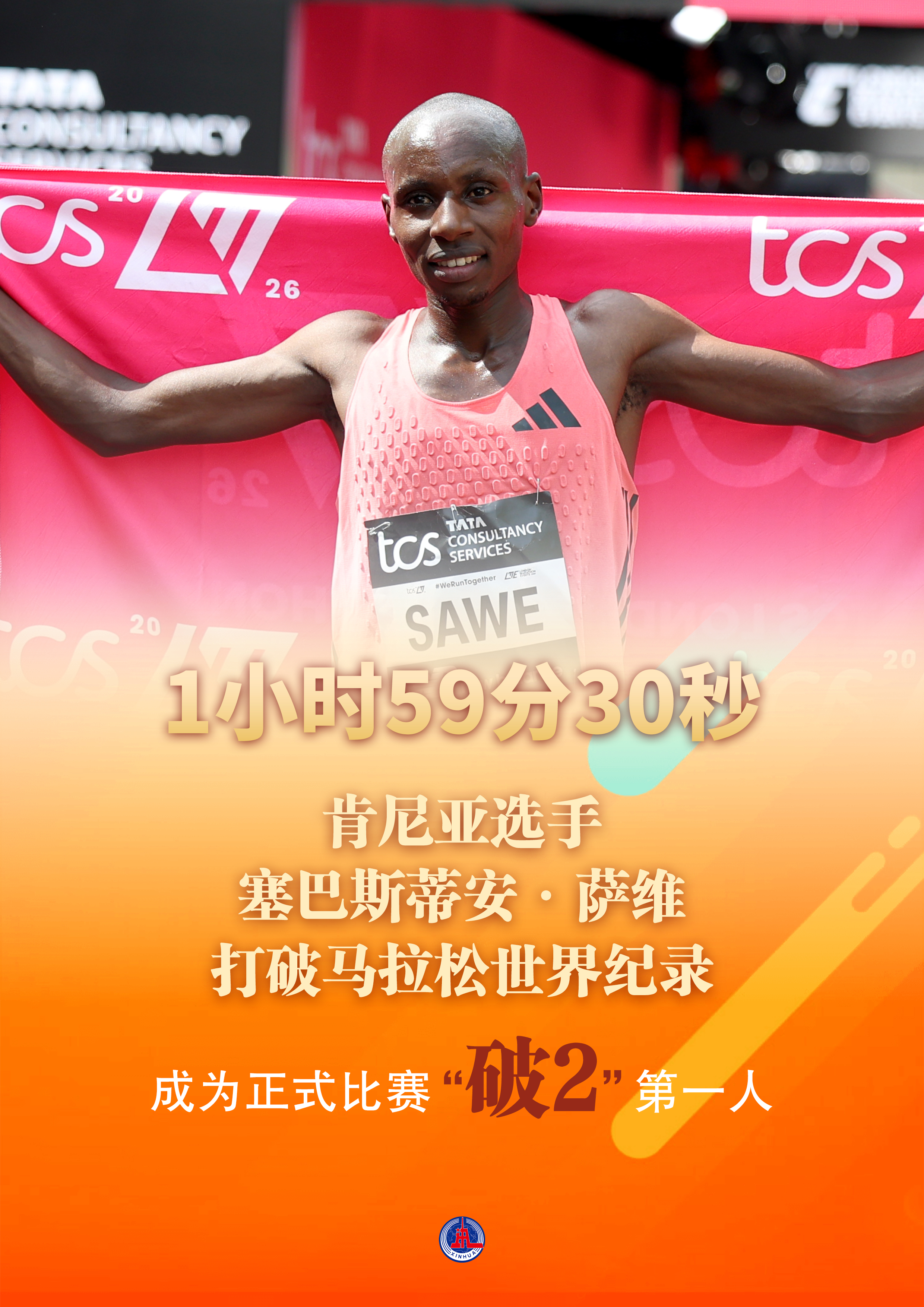 新华社伦敦4月26日电 在26日进行的伦敦马拉松赛上,来自肯尼亚的萨维以1小时59分30秒的成绩打破男子马拉松世界纪录。