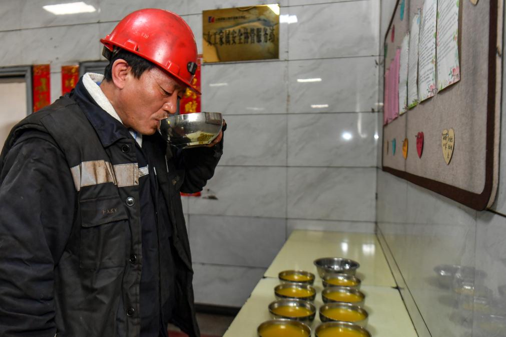 2026年4月21日,任世前在喝女工家属为工人们准备的小米汤。新华社记者 曹阳 摄