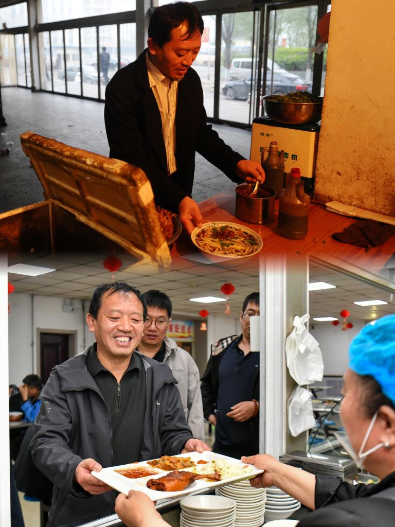 上图:2014年4月22日,任世前在矿上的食堂买了一碗面当早餐(新华社记者 燕雁 摄);下图:2026年4月21日,任世前(左前一)在食堂购买午饭(新华社记者 曹阳 摄)。