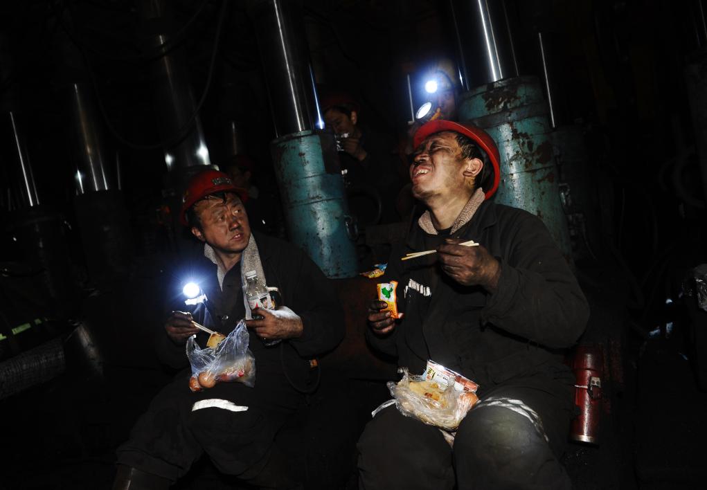 2014年4月22日,任世前(右)和工友在井下吃午饭。新华社记者 燕雁 摄