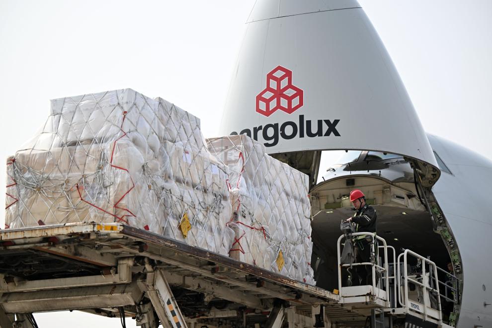 工作人员在郑州新郑国际机场为一架卢森堡货航货机卸货。近年来,河南郑州在积极打造郑州—卢森堡“空中丝绸之路”的同时,积极拓展全球货运航线。目前,郑州机场国际货运航线已覆盖30余个国家,国际航空货运枢纽能级逐步提升。2025年,郑州机场年货邮吞吐量首次突破100万吨,跻身全球航空货运“百万吨级俱乐部”。新华社记者 李嘉南 摄