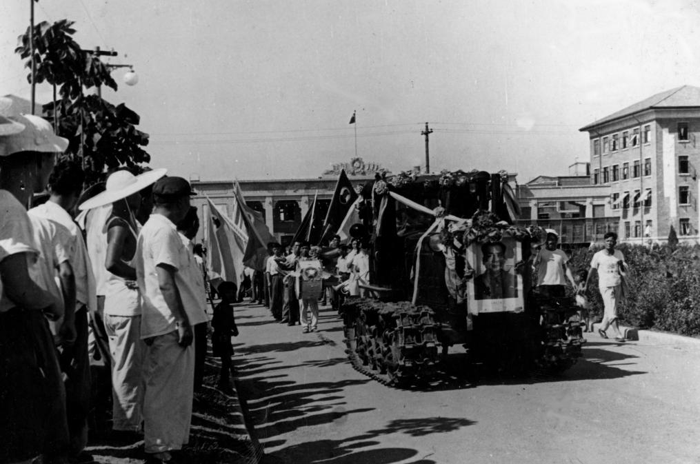 1958年7月20日,中国人自己制造的第一台拖拉机——东方红54履带拖拉机驶出一拖厂厂门(资料照片)。新华社发