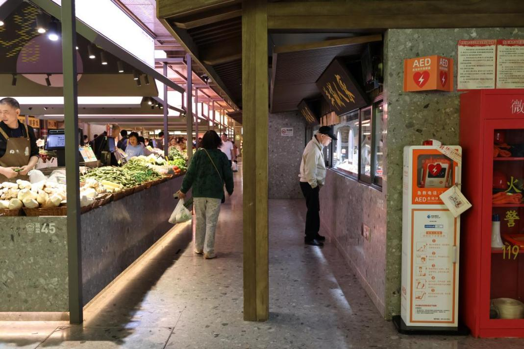 4月9日,改造后的浙江省杭州市文二菜市配备了AED设备。新华网发(曹泽摄)