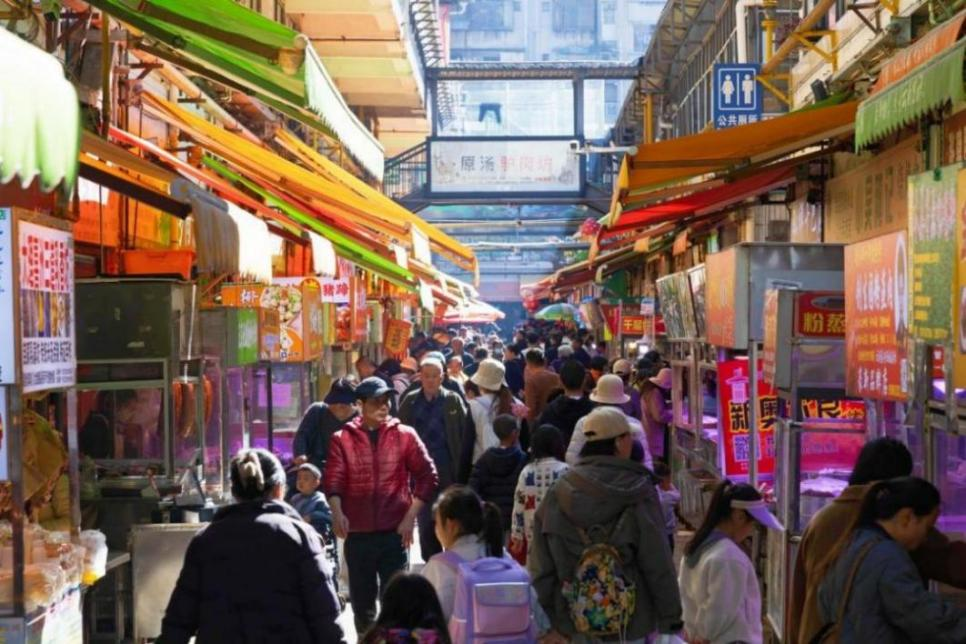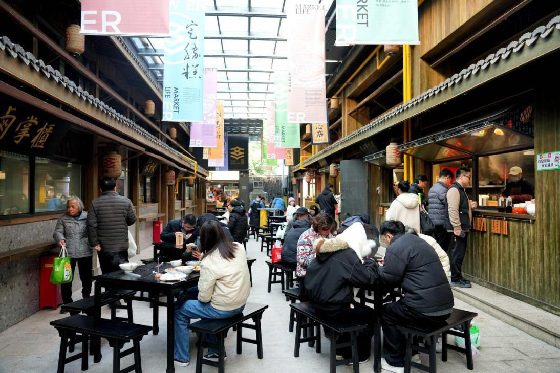 1月8日,市民游客在浙江省杭州市文二菜市的宋韵小吃街上品尝美食。新华网发