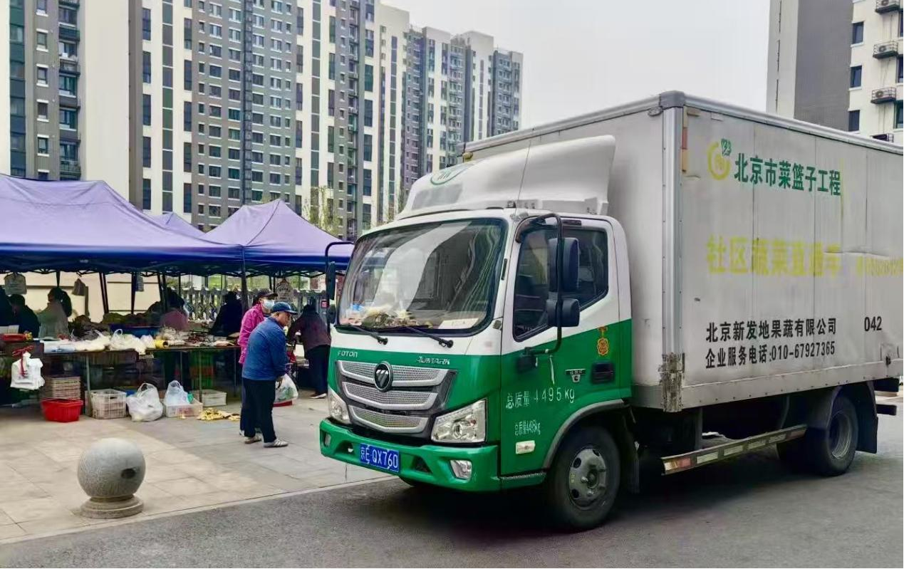 4月14日,新发地菜篮子工程社区蔬果直通车在北京市丰台区看丹街道看丹村供应生鲜产品。(新发地农产品批发市场供图)