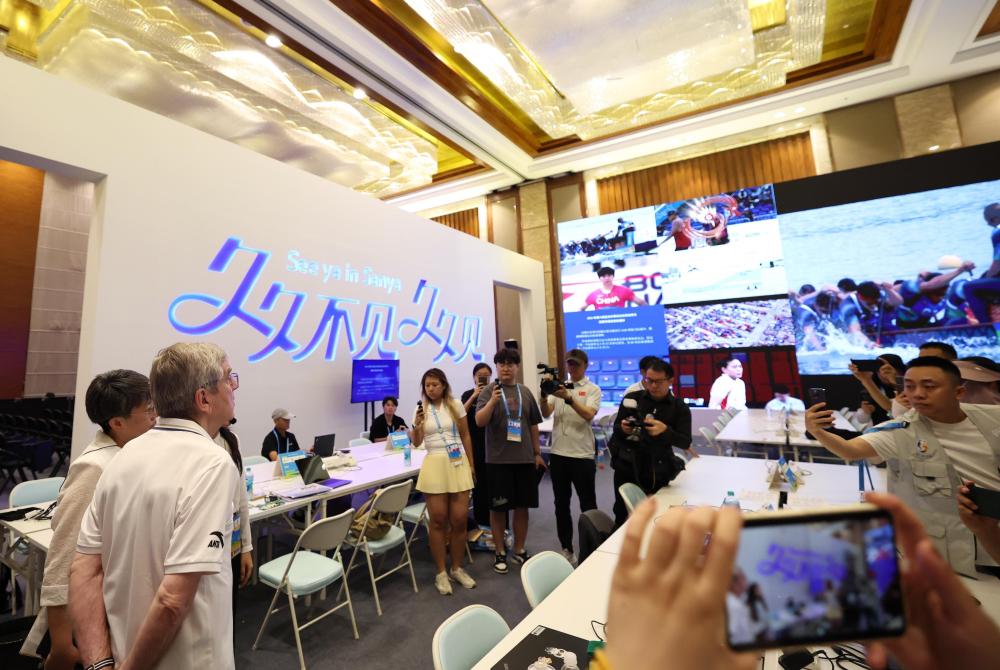 2026年4月25日,国际奥委会终身名誉主席巴赫(左二)在三亚亚沙会主媒体中心工作间参观。新华社记者 胡星宇 摄
