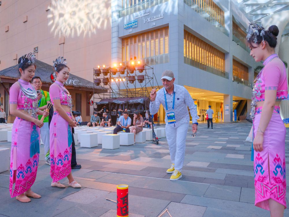 2026年4月28日,在第六届亚洲沙滩运动会运动员村内,外国运动员体验投壶。 新华社记者 马金瑞 摄