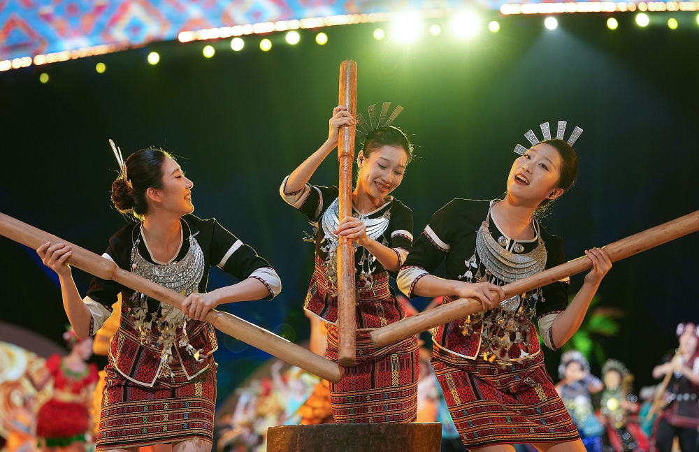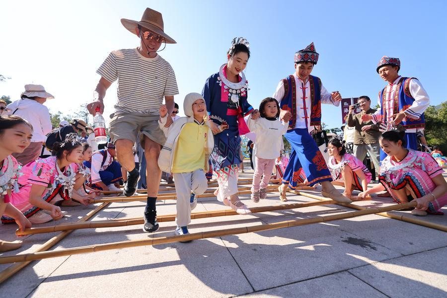 2026年1月1日,游客在海南省三亚南山文化旅游区跳竹竿舞。新华社发(陈文武 摄)