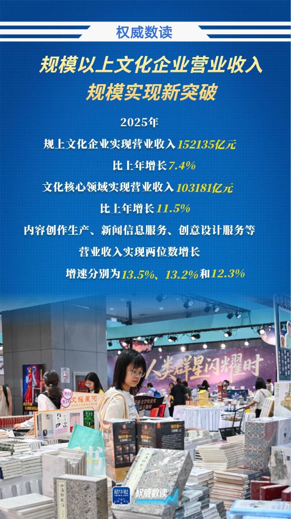 国家统计局30日发布数据,2025年全国规模以上文化及相关产业企业实现营业收入152135亿元,比上年增加10451亿元,增长7.4%。文化产业发展稳中向好,展现强劲韧性与活力,持续赋能经济社会高质量发展。跟随一组海报,一起去看看吧。