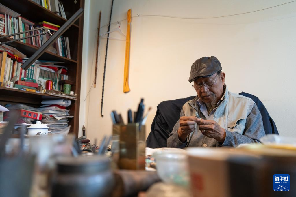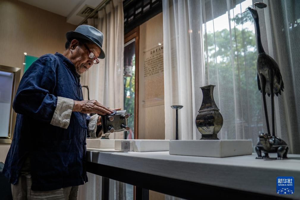 10月25日,在昆明乌铜走银传习馆,金永才在擦拭保养乌铜走银作品。