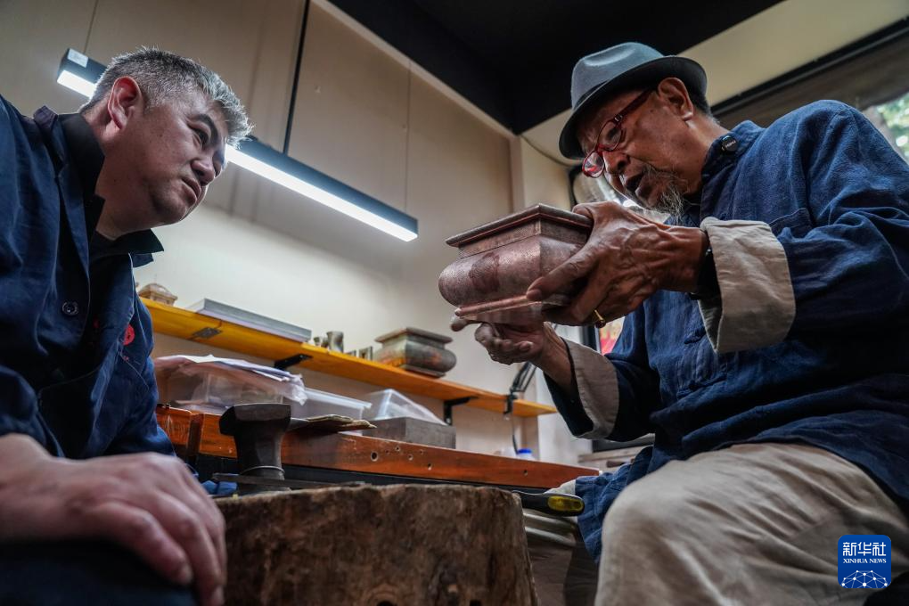 10月25日,在昆明乌铜走银传习馆內,匠人在捶打铜片。