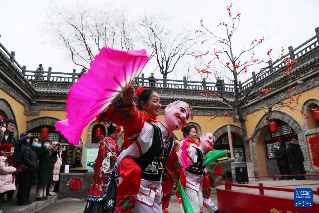 12月21日,游客在河南省三门峡市陕州区张汴乡北营村地坑院欣赏社火表演。