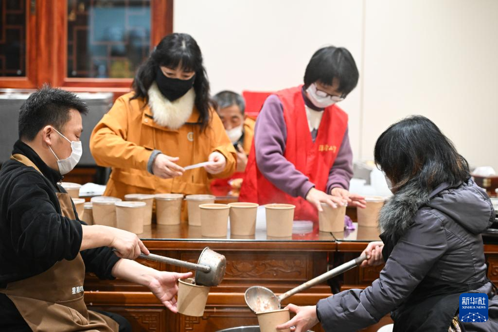 1月26日早晨,在浙江省金华市市区,当地总工会和爱心公益协会工作人员在街边给户外劳动者和市民免费发放腊八粥。