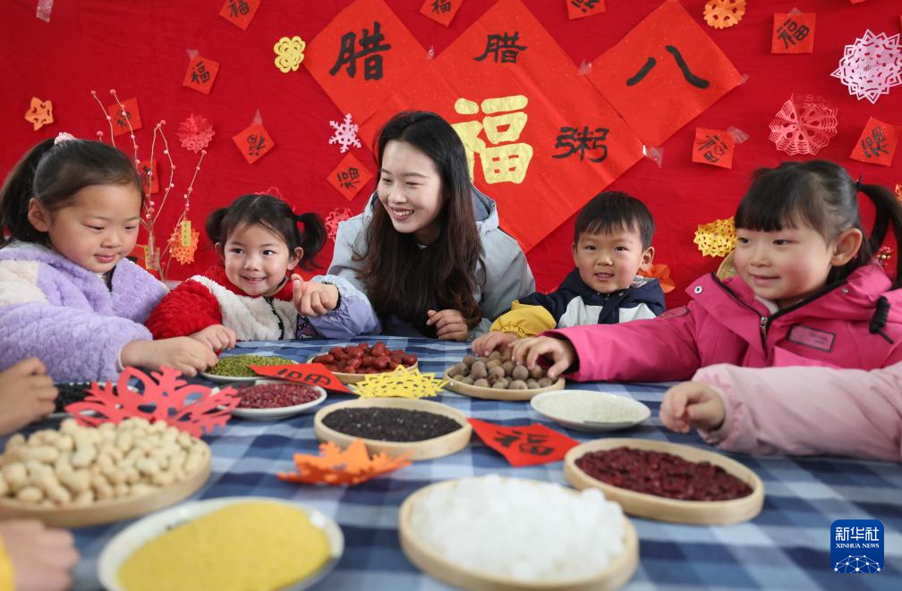 1月26日,在河南省济源市第一幼儿园,老师教小朋友们辨认制作腊八粥的食材。