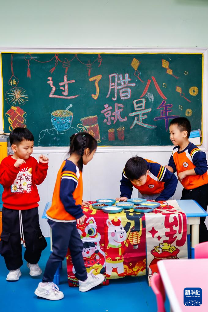 1月26日,在河北省石家庄市新华区柏林幼儿园,小朋友们体验制作腊八粥。