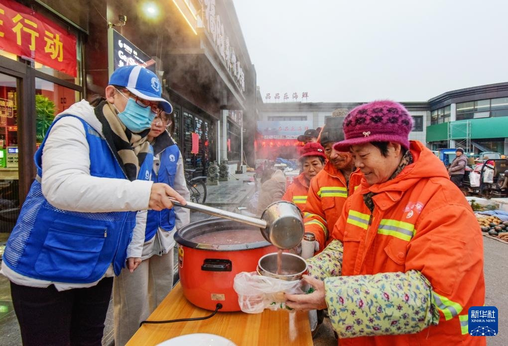 1月26日,在山东省胶州市三里河街道,志愿者为环卫工人盛腊八粥。