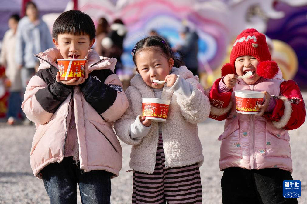 1月26日,在宁夏固原市隆德县民俗文化节现场,小朋友品尝腊八粥。