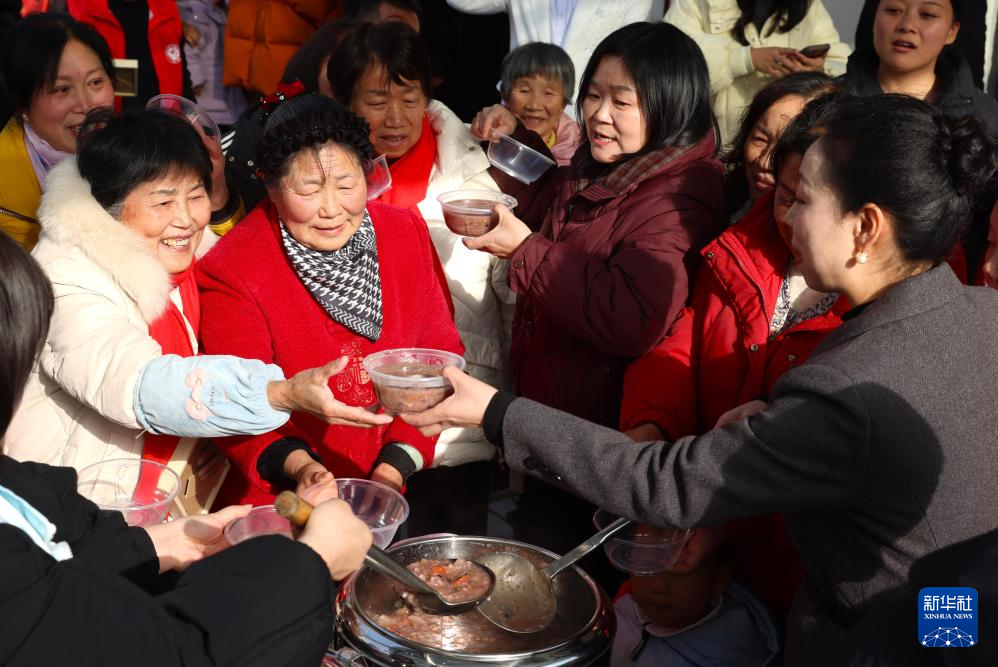 1月26日,在山东省青岛市李沧区颐福养老院,志愿者为老人们送上腊八粥。