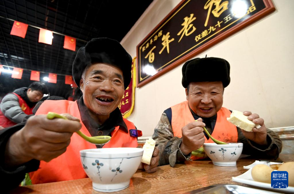 1月26日,环卫工人在河北省邯郸市峰峰矿区一家餐厅品尝腊八粥。