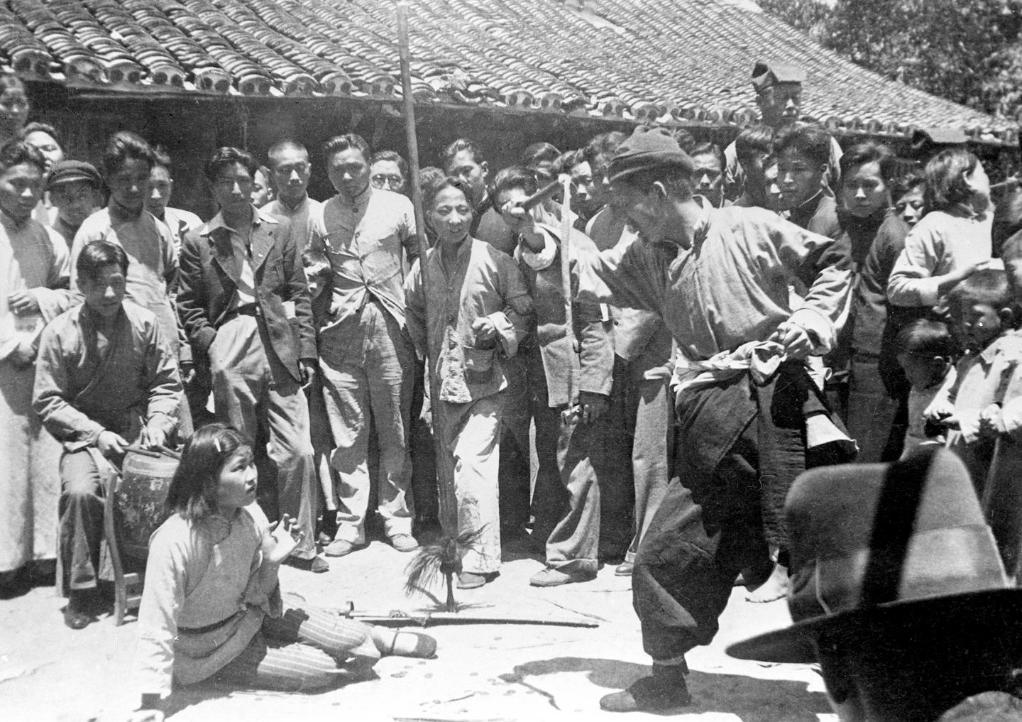在国民党统治区,进步的文艺团体到农村演出抗战话剧《放下你的鞭子》。该剧是“国防戏剧”代表作。(新华社发)
