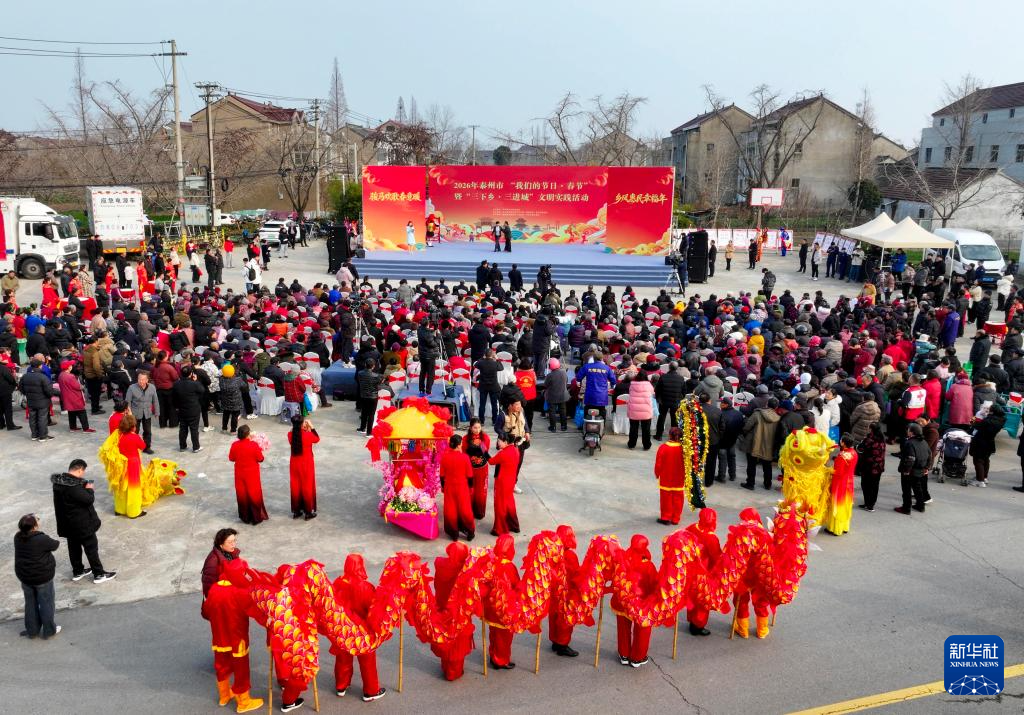 2月2日,2026年泰州市“我们的节日·春节”暨“三下乡·三进城”文明实践活动在江苏泰州医药高新区(高港区)许庄街道蔡庄村举行。活动涵盖民俗展示、文艺演出、志愿服务、年货展销等特色活动板块,为当地群众送上丰盛的文化大餐与暖心服务。